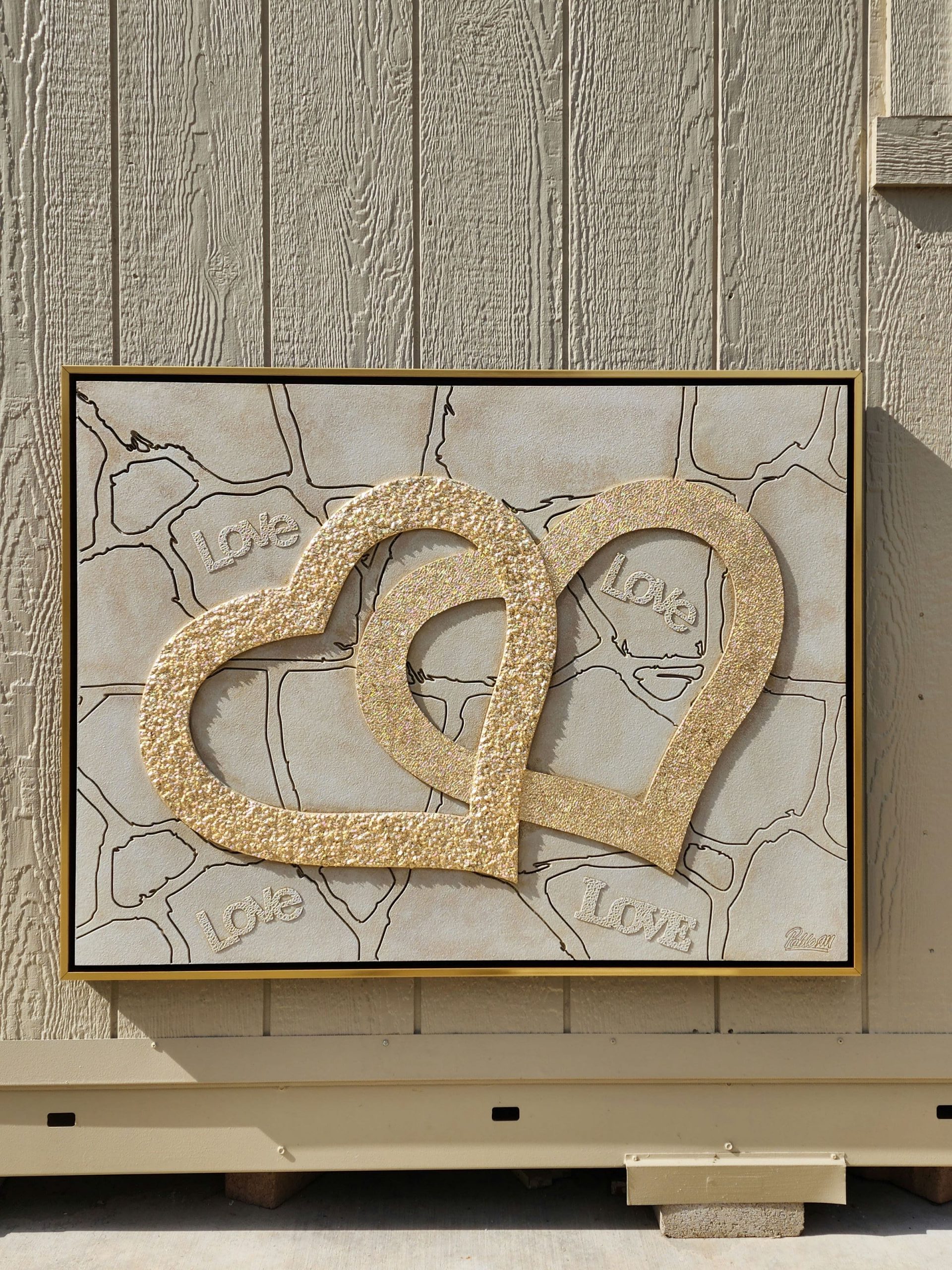 This hand-made Heart Artwork features two gold leaf hearts. This artwork makes a great addition to any room! The textured gold hearts make this artwork standout.